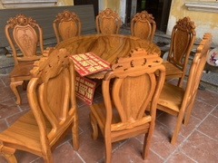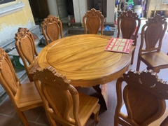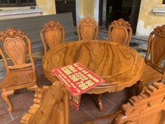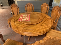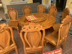 Bộ bàn ghế ăn tròn gỗ gõ đỏ 8 ghế hoa lá tây ván tràn, mâm xoay